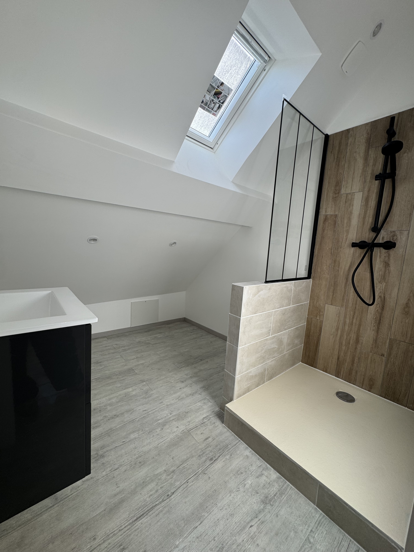 À l’étage, une chambre confortable avec sa salle d’eau attenante comprenant une douche et un meuble vasque.